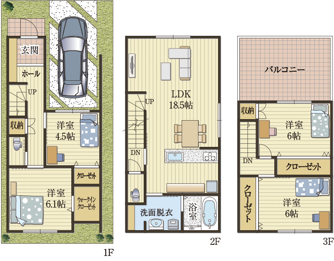 - 1階・3階の各居室にウォークインクローゼットを完備。たっぷり収納できて、お部屋がすっきり片付きます。